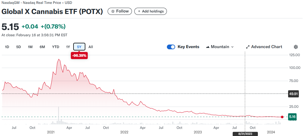 - Global X Cannabis ETF는 대마초 산업의 성장을 따라가며, 미래의 법적 환경 변화와 산업 확대에 대한 기대감을 제공합니다. 하지만 투자했으면 손실이 큽니다.