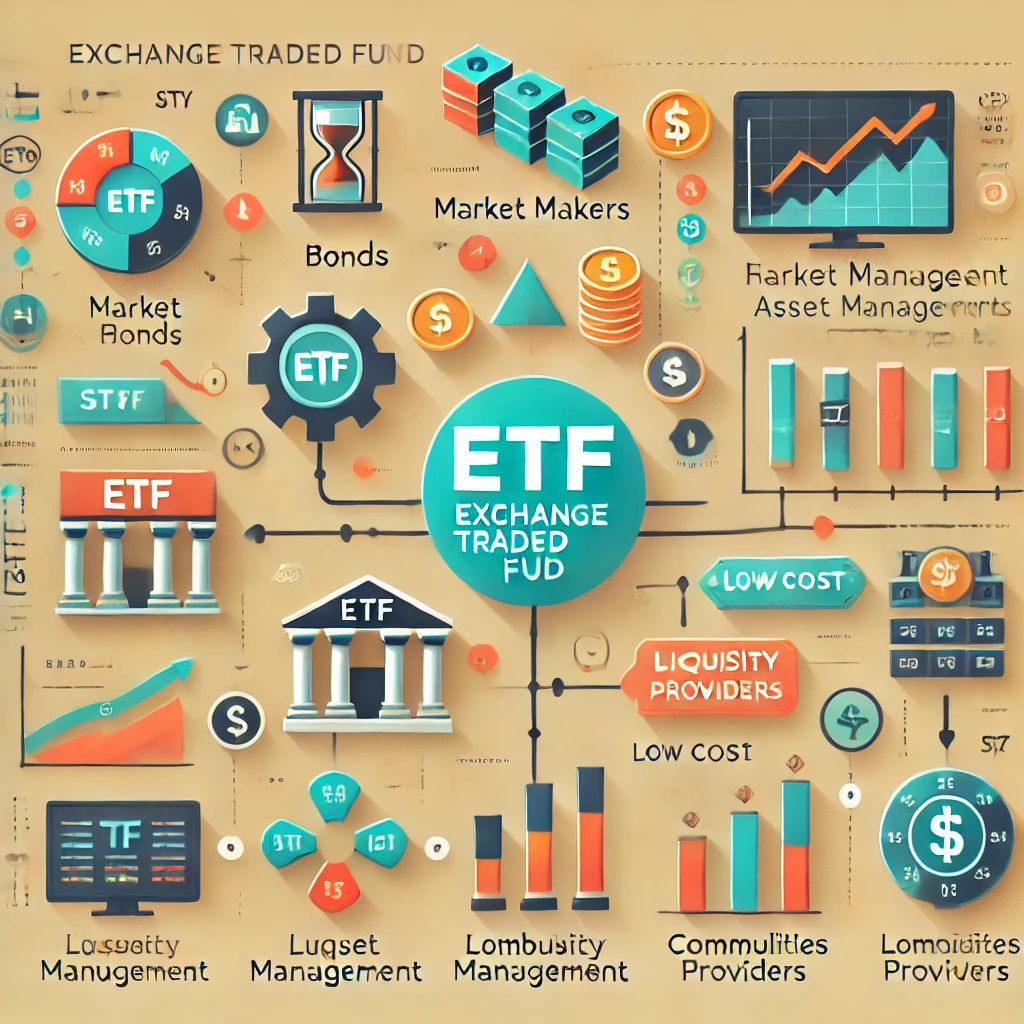 ETF는 상장지수펀드로, 주식처럼 거래소에서 사고팔 수 있는 펀드입니다. ETF는 지수 추종형 펀드로, 지수 또는 자산군을 그대로 추종하는 방식으로 운영됩니다. ETF의 핵심 구조는 다음과 같습니다: